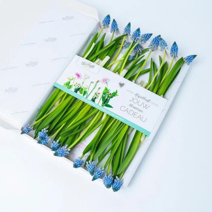 Een bos blauwe druifjes, of ook wel Muscari genoemd, bestel je heel eenvoudig en snel bij BloomGift. Deze blauwe voorjaarsbloemen zijn erg leuk om iemand mee te verrassen. Of je ze nu in de woonkamer wilt zetten, naast het Tv-meubel of op de eetkamertafel, deze bloemen passen bij elk interieur. Het leuke aan deze bloemen is, de ontvanger hoeft er niet speciaal voor thuis te zijn. De blauwe druifjes worden gewoon per post bezorgd. Maak je brievenbus verrassing compleet en voeg een persoonlijk kaartje aan je blauwe druifjes toe. Wie ga jij verrassen met deze bloemen?