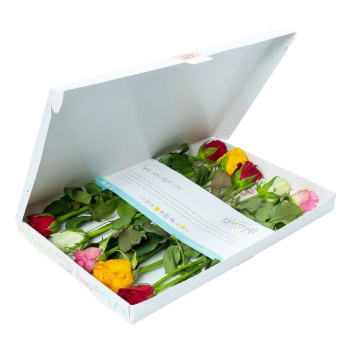 10 verse gemengde rozen in een vrolijke brievenbusverpakking.