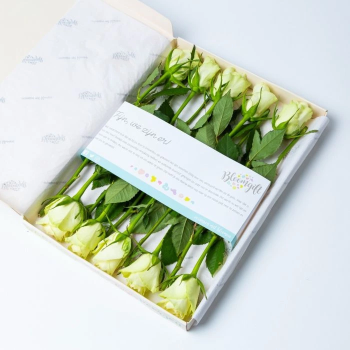 Verras iemand met deze prachtige witte rozen! 10 mooie kwalitatieve witte rozen in een brievenbusdoosje voorzien van een doorzichtige versheidsfolie. Een ideale verrassing om iemand cadeau te doen. Nadat de rozen door de postbode door de brievenbus zijn gedaan mag de ontvanger ze wakker maken door ze op water te zetten.