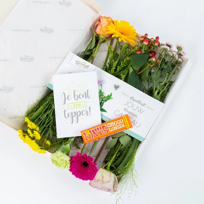 Wil je graag je iemand bedanken. Zeg het dan met de brievenbusbloemen. Een mix aan kleurrijke bloemen gecombineerd met een vouwvaas en Tony Chocolonely karamel zeezout reepje. Voeg er zelf nog een leuk wenskaartje aan toe met een persoonlijke boodschap. Zodra de geslaagde jouw verrassing ontvangt, zal hij of zij compleet verrast zijn. Het leuke aan dit brievenbuscadeau is, wij bezorgen het gewoon door de brievenbus. Je broer of zus hoeft er niet speciaal voor thuis te zijn. Leuk toch?