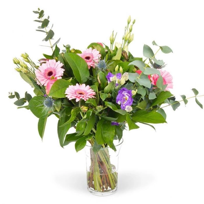 Op zoek naar een leuk Moederdag boeket? Bekijk dan eens ons Moederdag boeket XL. Dit boeket is perfect voor wanneer je wilt laten weten dat je om je moeder geeft of als je haar wilt bedanken. De lichtpaarse lisianthus en blauwe distels in dit Moederdag boeket worden prachtig gecombineerd met roze gerbera’s en pioenrozen tot een vrolijk en fris geheel. Voeg aan je Moederdag boeket XL nog een leuk wenskaartje toe en je verrassing is compleet! Maak je moeder blij en verras haar ook eens met dit leuke Moederdag boeket van Bloomgift.