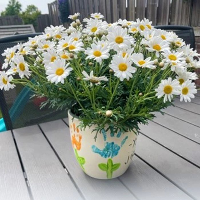 Tip: Versier de pot met leuke handafdrukken van de (klein)kinderen. Bijvoorbeeld d.m.v. verf en een cellofaan om de struikmargriet.