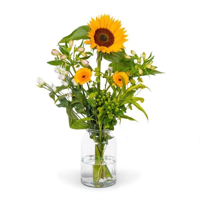 Wil je iemand deze Zomer een glimlach bezorgen? Of zoek je een vrolijk zomers plukboeket voor thuis? Speciaal voor de Zomer hebben wij dit boeket samengesteld. De geel-wit-groene kleuren kenmerken dit zomerse boeket. De gele gerbera’s, de roze alstroemeria ’s, de witte lisianthus en in het midden een mooie grote zonnebloem maken dit plukboeket af. Maak je plukboeket bestelling compleet en voeg er nog een leuk wenskaartje met persoonlijke boodschap aan toe. Dit plukboeket is leverbaar inclusief vaas. Wacht niet langer en bestel dit vrolijke plukboeket snel online. In slecht enkele stappen heb jij al dit plukboeket bij Bloomgift besteld.