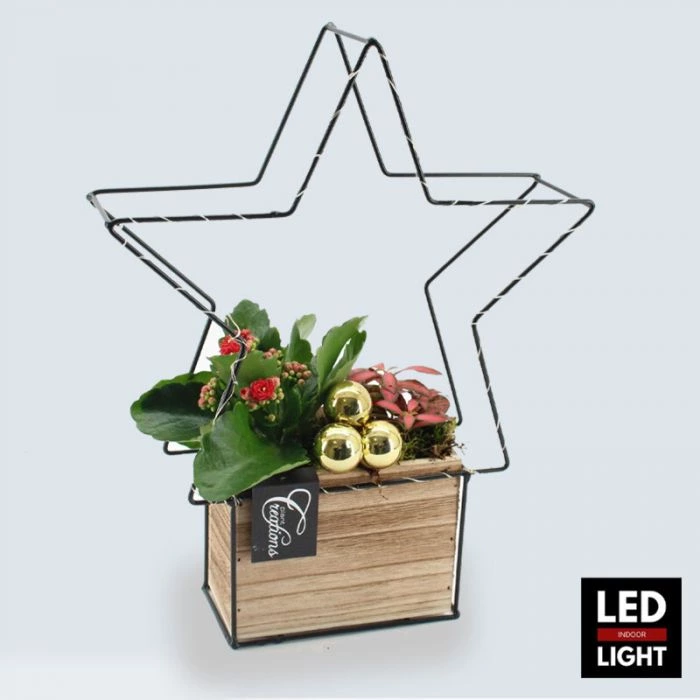 Op zoek naar een origineel kerstcadeau? Speciaal voor kerst hebben wij deze leuke kerstster inclusief LED lichtjes samengesteld. De kerstster zit vast aan een houten blokje gevuld met een wit kalanchoë plantje, creme kerstballetjes en een klein stekje. De zwart ster geeft een industriële look en past in vrijwel elk interieur. Leuk voor jezelf, maar nog veel leuk om iemand met kerst cadeau te geven. Wij verpakking deze Shiny Star kerstcreatie zorgvuldig in.